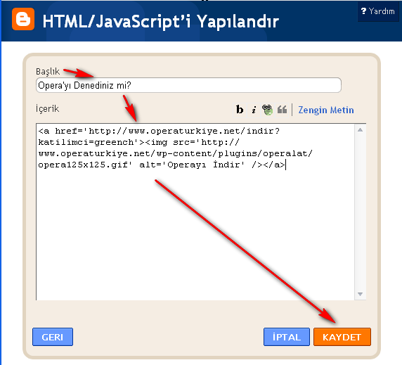 Bu adresten aldığınız ya da kendi hazırladığınız gerekli kodları hemen alt satırına yapıştırın.